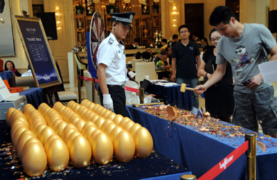 8月31日,一位購房者正在一家房產(chǎn)公司的售樓部“砸金蛋”,杭州樓市取消限購后,各大房產(chǎn)公司開始用各種方式招徠購房者。8月29日,杭州樓市全面取消限購,并將二套房首付降低至六成,受此影響杭州樓市的成交量開始放大,據(jù)杭州透明售房網(wǎng)統(tǒng)計(jì),8月30日杭州主城區(qū)單日成交已經(jīng)突破350套,本周(8月24日-8月30日)主城區(qū)商品房成交1303套,較上周(766套)環(huán)比上升70%,本周日均成交186套。