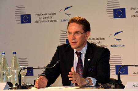 9月13日,在意大利米蘭,歐盟委員會負責(zé)經(jīng)濟與貨幣事務(wù)委員卡泰寧出席新聞發(fā)布會。 當(dāng)日,歐盟輪值主席國意大利的經(jīng)濟部長帕多安在米蘭歐盟財政部長非正式會議結(jié)束時說,促進歐洲經(jīng)濟增長需要更多投資,尤其需要私人投資以及發(fā)揮催化劑作用的公共投資,為此需要創(chuàng)造盈利條件,特別是通過結(jié)構(gòu)性改革為投資解凍。