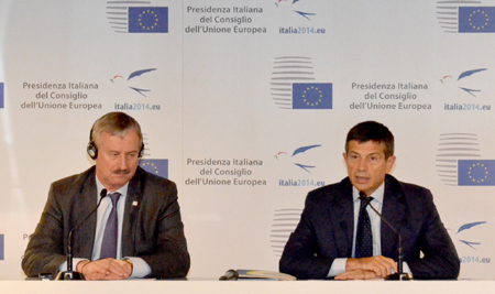 9月17日,在意大利米蘭,意大利基礎(chǔ)設(shè)施和交通部長毛里齊奧·盧皮(右)與歐盟委員會副主席、負(fù)責(zé)交通事務(wù)的委員西姆·卡拉斯共同出席新聞發(fā)布會。 為期兩天的歐盟交通部長非正式會議17日在米蘭閉幕,作為成果,會議宣布了一份泛歐鐵路網(wǎng)優(yōu)先建設(shè)發(fā)展的9條動(dòng)脈線路規(guī)劃,稱為9條“走廊”方案。