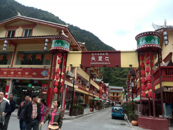 在四川省九寨溝風(fēng)景區(qū)溝口,一座新立的寫著“天堂口”字樣的藏式牌坊引起過(guò)往游人的注意:四排風(fēng)格統(tǒng)一的藏式民居坐落在群山環(huán)抱中,三條主題各異的民俗風(fēng)情街迎接八方來(lái)客。在這片占地一萬(wàn)多平方米的藏式文化街區(qū)里,游人們可以品藏家美食、覽九寨文化。
