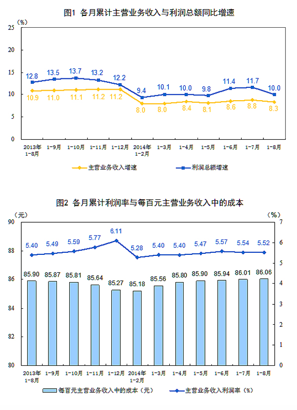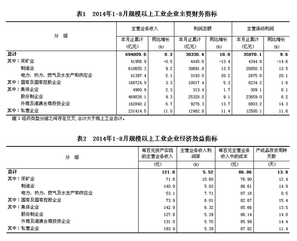 1-8月份,規(guī)模以上工業(yè)企業(yè)主營(yíng)業(yè)務(wù)收入利潤(rùn)率為5.52%,每百元主營(yíng)業(yè)務(wù)收入中的成本為86.06元,每百元資產(chǎn)實(shí)現(xiàn)的主營(yíng)業(yè)務(wù)收入為121.8元,產(chǎn)成品存貨周轉(zhuǎn)天數(shù)為13.9天。