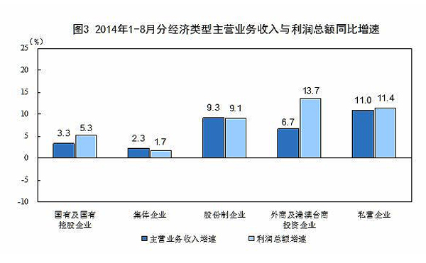 1-8月份,在規(guī)模以上工業(yè)企業(yè)中,國(guó)有及國(guó)有控股企業(yè)實(shí)現(xiàn)利潤(rùn)總額10017.4億元,同比增長(zhǎng)5.3%;集體企業(yè)實(shí)現(xiàn)利潤(rùn)總額313.4億元,增長(zhǎng)1.7%;股份制企業(yè)實(shí)現(xiàn)利潤(rùn)總額25328億元,增長(zhǎng)9.1%;外商及港澳臺(tái)商投資企業(yè)實(shí)現(xiàn)利潤(rùn)總額9276.3億元,增長(zhǎng)13.7%;私營(yíng)企業(yè)實(shí)現(xiàn)利潤(rùn)總額12462.8億元,增長(zhǎng)11.4%。