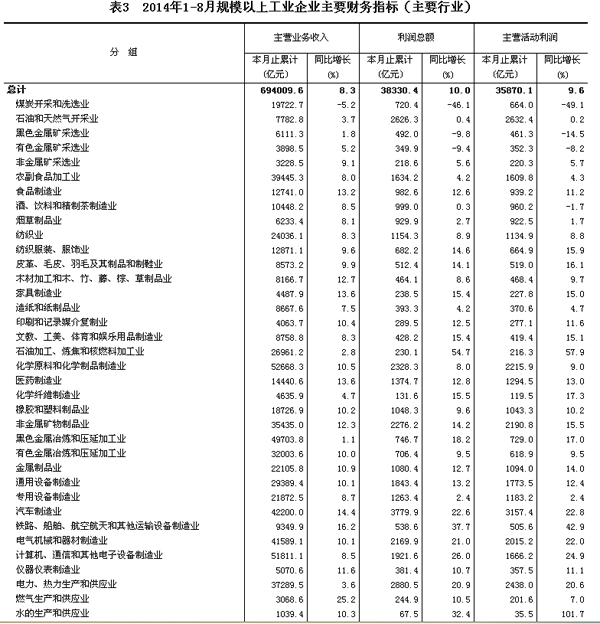 1-8月份,全國(guó)規(guī)模以上工業(yè)企業(yè)實(shí)現(xiàn)利潤(rùn)總額38330.4億元,同比增長(zhǎng)10%,增速比1-7月份回落1.7個(gè)百分點(diǎn);實(shí)現(xiàn)主營(yíng)活動(dòng)利潤(rùn)35870.1億元,同比增長(zhǎng)9.6%,增速比1-7月份回落1.6個(gè)百分點(diǎn)。