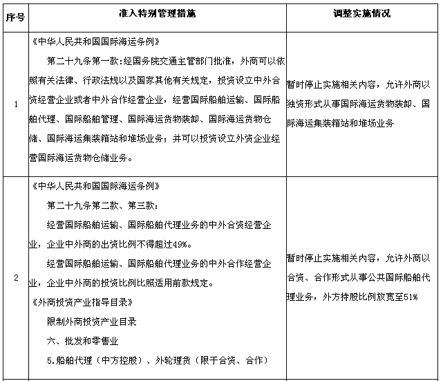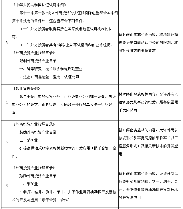 為適應在中國(上海)自由貿(mào)易試驗區(qū)進一步擴大開放的需要,國務院決定在試驗區(qū)內(nèi)暫時調(diào)整實施《中華人民共和國國際海運條例》、《中華人民共和國認證認可條例》、《鹽業(yè)管理條例》以及《外商投資產(chǎn)業(yè)指導目錄》、《汽車產(chǎn)業(yè)發(fā)展政策》、《外商投資民用航空業(yè)規(guī)定》規(guī)定的有關資質(zhì)要求、股比限制、經(jīng)營范圍等準入特別管理措施(目錄附后)。