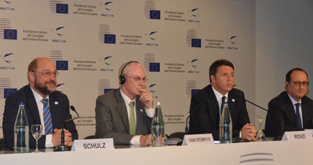 10月8日,歐盟有關(guān)就業(yè)問題的高級別會議在意大利米蘭舉行,與會領(lǐng)導(dǎo)人呼吁更有效地利用歐盟資金,來應(yīng)對歐盟國家目前面臨的主要挑戰(zhàn),即年輕人失業(yè)問題。 圖為當(dāng)日歐洲議會議長舒爾茨(左一)、歐洲理事會主席范龍佩(左二)、意大利總理倫齊(右二)和法國總統(tǒng)奧朗德出席新聞發(fā)布會。