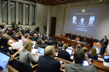 10月6日,在瑞典首都斯德哥爾摩卡羅琳醫(yī)學(xué)院,諾貝爾獎評委會成員奧勒·基恩教授(右一)介紹2014年諾貝爾生理學(xué)或醫(yī)學(xué)獎得主。