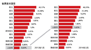 環(huán)球同業(yè)銀行金融電訊協(xié)會(huì)(SWIFT)數(shù)據(jù)顯示,人民幣繼美國(guó)之后在2013年12月取代了歐元,成為全球貿(mào)易金融中使用率第二高的貨幣。另外,人民幣已經(jīng)躍升為第七大國(guó)際支付貨幣。星展銀行經(jīng)濟(jì)學(xué)家周洪禮表示,隨著境外普及率的不斷提高,人民幣國(guó)際化機(jī)制正逐漸成形。盡管人民幣并未達(dá)到基本可兌換的地位,但很多國(guó)家的央行已經(jīng)開(kāi)始將人民幣納入該國(guó)的官方外幣資金。