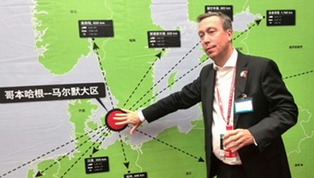 由瑞典、丹麥兩國(guó)組成的哥本哈根-馬爾默大區(qū)商務(wù)代表團(tuán)14日在深圳推介營(yíng)商環(huán)境,招徠中國(guó)企業(yè)前往投資。位于大區(qū)中的哥本哈根-馬爾默港是本次推介活動(dòng)的重點(diǎn)項(xiàng)目。憑借輻射歐洲的戰(zhàn)略位置、優(yōu)越的物流交通樞紐地位,以及潛力巨大的工業(yè)園區(qū),這個(gè)綜合性綠色港口希望與中國(guó)企業(yè)深度合作,實(shí)現(xiàn)“雙贏”。圖為哥本哈根-馬爾默港總裁約翰·瑞斯汀介紹港口環(huán)境。