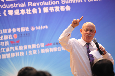 美國(guó)著名趨勢(shì)學(xué)家杰里米·里夫金16日在本報(bào)和中信出版社聯(lián)合主辦的“2014第三次工業(yè)革命高峰論壇”上表示,中國(guó)應(yīng)加快向“零邊際成本社會(huì)”推進(jìn),這會(huì)使中國(guó)一直到2050年持續(xù)保持繁榮。本次論壇獲安徽江淮汽車股份有限公司支持。