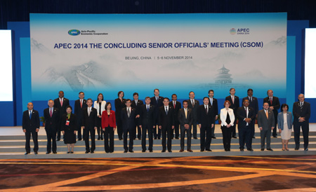 11月5日,2014年亞太經(jīng)合組織(APEC)最后一次高官會(huì)在北京國家會(huì)議中心舉行,拉開了今年APEC領(lǐng)導(dǎo)人會(huì)議周大幕。這是出席會(huì)議的高級(jí)官員合影。