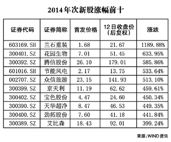 WIND統(tǒng)計數(shù)據(jù)顯示,截至目前,今年以來A股共計有103只新股上市,平均發(fā)行價格為17.84元,平均發(fā)行市盈率(攤。﹦t為24.17倍。上述103只新股上市首日的平均漲幅為43.42%,上市以來的平均漲幅則為206.91%。在這103只新股中,有98只上市首日觸及了44%的漲幅上限。除了蘭石重裝之外,包括花園生物、騰信股份、節(jié)能風(fēng)能和眾信旅游在內(nèi)的4只新股的累計漲幅均超過500%。