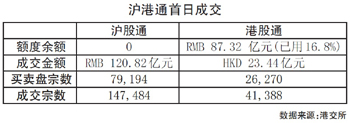 滬港通啟動首日,早盤截至10:00,滬股通買入71.94億元,賣出0億元,使用額度約71.94億元,剩余額度48.06億元。港股通買入8.54億元,賣出0.11億元,使用額度約7.81億元,剩余額度97.19億元。截至下午16時,滬股通買入120.82億元,賣出0億元;報進買單未成交但未撤單的占了9.18億元;合計使用額度130億元,剩余額度0億元,觸及單日額度限制。港股通買入22.38億港元(人民幣17.73億元),賣出1.06億港元(人民幣0.84億元),使用額度17.673億元,剩余額度87.327億元。