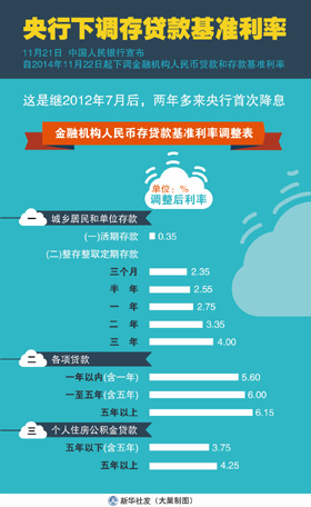 央行近日宣布,自2014年11月22日起下調(diào)金融機(jī)構(gòu)人民幣貸款和存款基準(zhǔn)利率。金融機(jī)構(gòu)一年期貸款基準(zhǔn)利率下調(diào)0.4個百分點(diǎn)至5.6%;一年期存款基準(zhǔn)利率下調(diào)0.25個百分點(diǎn)至2.75%。與此同時,央行宣布,結(jié)合推進(jìn)利率市場化改革,將金融機(jī)構(gòu)存款利率浮動區(qū)間的上限由存款基準(zhǔn)利率的1.1倍調(diào)整為1.2倍。