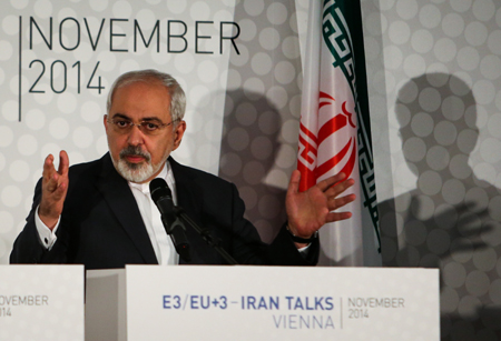 在24日于維也納結(jié)束的新一輪伊朗核問題談判未能達(dá)成協(xié)議,伊核問題六國和伊朗談判各方同意將談判延長7個月,到明年6月30日。談判延期避免了伊朗重啟核計(jì)劃的可能,也避免了西方如果恢復(fù)對伊朗的全面制裁可能對伊朗經(jīng)濟(jì)造成的沖擊。英國外交大臣哈蒙德向外媒表示,在核談判延期的數(shù)月間,伊朗每月還將獲得約7億美元解凍資產(chǎn)。 圖為11月24日,在奧地利維也納,伊朗外長扎里夫出席新聞發(fā)布會。