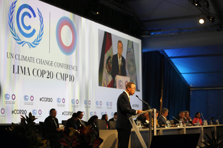 聯(lián)合國(guó)氣候大會(huì)高級(jí)別會(huì)議12月9日在秘魯首都利馬開(kāi)幕,聯(lián)合國(guó)秘書(shū)長(zhǎng)潘基文呼吁達(dá)成氣候變化協(xié)議草案并最終在巴黎氣候大會(huì)上獲得通過(guò)。圖為潘基文在會(huì)上講話(huà)。