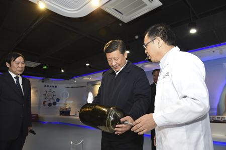 12月13日至14日,中共中央總書(shū)記、國(guó)家主席、中央軍委主席習(xí)近平在江蘇調(diào)研。習(xí)近平強(qiáng)調(diào),把經(jīng)濟(jì)發(fā)展抓好,關(guān)鍵還是轉(zhuǎn)方式、調(diào)結(jié)構(gòu),推動(dòng)產(chǎn)業(yè)結(jié)構(gòu)加快由中低端向中高端邁進(jìn)。圖為13日,習(xí)近平在江蘇省產(chǎn)業(yè)技術(shù)研究院調(diào)研。