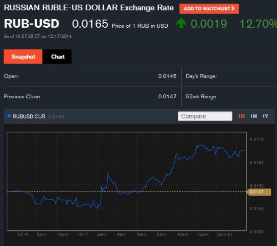 北京時間6點整,盧布兌美元報0.0165,漲幅為12.7%創(chuàng)1998年以來之最,盤中最高漲幅一度超16%。