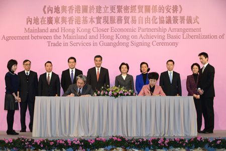 12月18日,《關(guān)于內(nèi)地在廣東與香港基本實(shí)現(xiàn)服務(wù)貿(mào)易自由化的協(xié)議》在港簽署,《協(xié)議》即日生效并在2015年3月1日實(shí)施。商務(wù)部表示,《協(xié)議》簽署后,內(nèi)地將在廣東率先與香港基本實(shí)現(xiàn)服務(wù)貿(mào)易自由化,同時為內(nèi)地全境與香港基本實(shí)現(xiàn)服務(wù)貿(mào)易自由化先行先試積累經(jīng)驗(yàn)。此間特區(qū)政府及工商界人士認(rèn)為,《協(xié)議》為內(nèi)地對香港開放市場帶來突破性的發(fā)展,有利于進(jìn)一步推進(jìn)兩地經(jīng)濟(jì)融合。