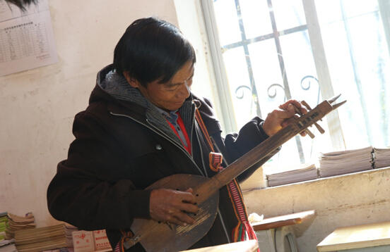 黝黑的膚色,一身灰藍(lán)色的棉布衣,帶著一頂具有民族特色的繡制帽子,身材略顯矮小但很結(jié)實(shí)的和盛偉透露出一種特別的“堅(jiān)韌”感。他在談起自己與四弦琴的特別緣分時(shí),很自然地拿出了自己的《殘疾證》,然后輕松地笑笑說(shuō):“我從小身體不方便,在十幾歲時(shí)開始拿起了四弦琴,跟著我爸爸學(xué)了起來(lái),這讓我多了很多快樂,也感覺有了很多希望!