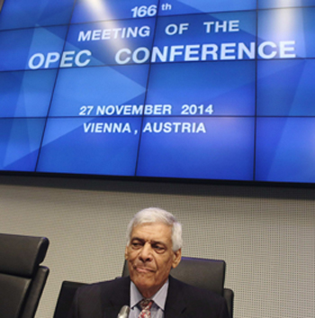 石油輸出國組織(歐佩克)部長級會議11月27日在奧地利維也納在歐佩克總部舉行,主題是討論過去幾個月不斷下跌的油價走勢和2015年石油市場前景。圖為歐佩克秘書長巴德里等待會議開始! ⌒氯A社/路透 |