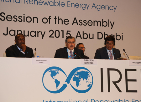 國際可再生能源組織第五屆年會17、18兩日在該組織總部所在地阿聯(lián)酋首都阿布扎比舉行,大會重點(diǎn)討論繼續(xù)向可再生能源項目增加投資的問題,研究加快可再生能源產(chǎn)業(yè)發(fā)展的途徑,以應(yīng)對全球氣候變化、能源安全等方面的挑戰(zhàn)。 圖為該組織總干事阿德南·阿明(中)在主持會議。