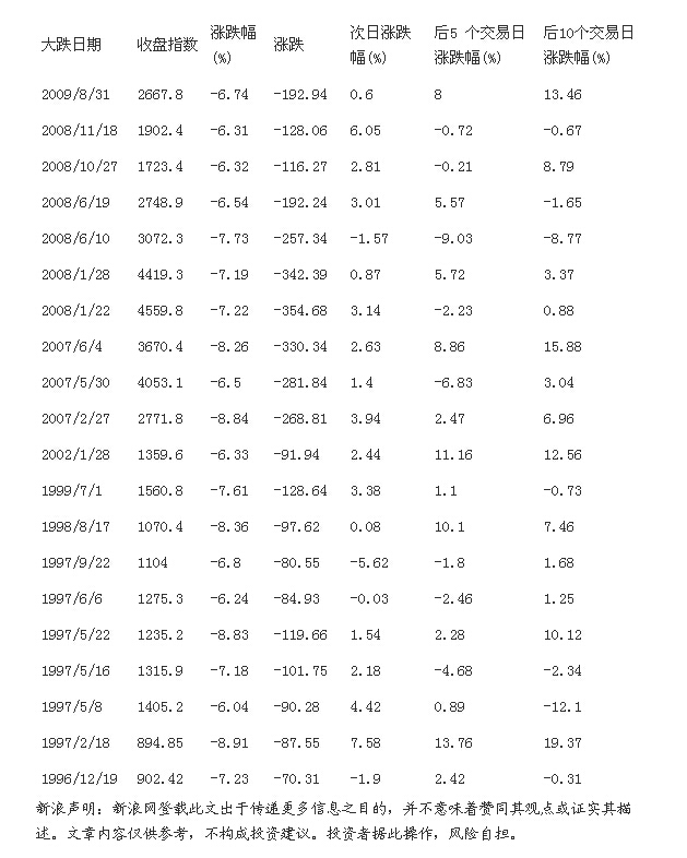 近年來上證指數(shù)跌幅超過6%后市場情況: