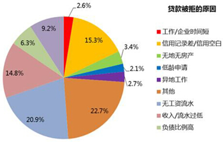 申請(qǐng)貸款為何被拒?這當(dāng)然是大家最關(guān)心的話題。大數(shù)據(jù)顯示,這其中的理由簡直五花八門,但無工資流水的用戶最悲催,占到了各種被拒理由的20.9%,因?yàn)榱魉、收入過低而被拒的用戶占14.8%,因此與收入相關(guān)的被拒原因合計(jì)占到了35.7%,可見銀行放貸款與否,申請(qǐng)人的收入是個(gè)至關(guān)重要的因素。