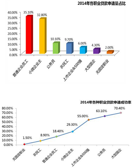 并不是只有窮人才需要貸款,2014年除了普通企業(yè)員工和小微企業(yè)主這兩大主力外,公務(wù)員、農(nóng)民工、上市企業(yè)和500強(qiáng)公司員工、大型國企員工,以及無固定職業(yè)者都需要通過貸款來解決缺錢問題。在貸款成功率排名上,大型國企員工以70.40%位居榜首,公務(wù)員以63.10%緊隨其后,充分顯示出“鐵飯碗”的優(yōu)越性;而排在最后的無固定職業(yè)者的成功率僅有可憐的1.50%,幾乎是逢申請(qǐng)必被拒,農(nóng)民工8.90%的成功率同樣讓人心塞啊。