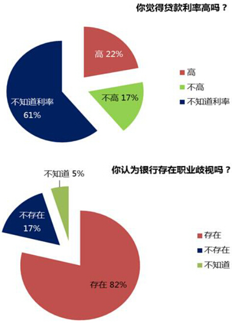 大數(shù)據(jù)發(fā)現(xiàn),其實(shí)很多人是糊里糊涂地去申請(qǐng)貸款的:61%的用戶不知道現(xiàn)在的貸款基準(zhǔn)利率是多少;僅有11%的用戶知道利率市場化;更糟糕的是,貸款前,49%的用戶對(duì)自己的信用記錄沒有了解,而超過八成的用戶認(rèn)為銀行貸款有職業(yè)歧視現(xiàn)象。