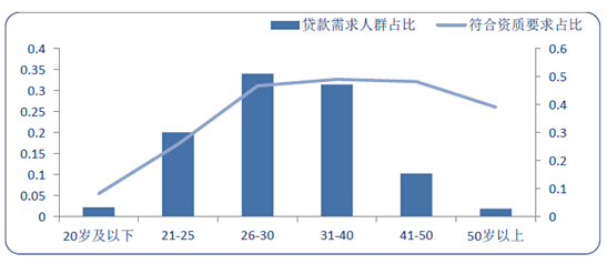 大數(shù)據(jù)告訴我們,2014年26-30歲和31-40歲兩個(gè)年齡段人群是貸款需求的主要人群,占比達(dá)65%,且審批通過率也很高;21-25歲人群占所有貸款申請(qǐng)人總數(shù)的20%,然而只有26%的人符合資質(zhì)要求,這一年齡階段的人普遍有大額消費(fèi)(買房、買車…)或創(chuàng)業(yè)需求,不過他們中的大部分人卻并不符合要求。