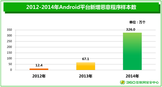 1月26日,360與中國互聯(lián)網(wǎng)協(xié)會12321舉報中心簽署戰(zhàn)略合作協(xié)議,即日起,兩大騷擾治理權威平臺將垃圾騷擾類信息共享,打造全民防騷擾直通車。在此次戰(zhàn)略合作發(fā)布會上,360互聯(lián)網(wǎng)安全中心正式發(fā)布《2014年中國手機安全狀況報告》(以下簡稱《報告》),報告顯示,2014全年360互聯(lián)網(wǎng)安全中心累計截獲Android平臺新增惡意程序樣本高達326.0萬個,為2013年的近4倍。