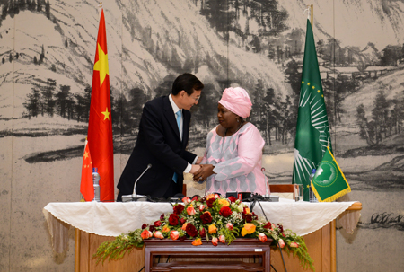 中國政府特使、外交部副部長張明27日在位于埃塞俄比亞首都亞的斯亞貝巴的非盟總部,與非盟委員會主席祖馬共同簽署中非關(guān)于基礎(chǔ)設(shè)施建設(shè)合作的諒解備忘錄。 根據(jù)備忘錄,中國將在非洲“2063年愿景”戰(zhàn)略框架內(nèi),加強與非洲國家在鐵路、公路、區(qū)域航空及工業(yè)化領(lǐng)域的合作,促進非洲國家一體化進程。 圖為張明(左)與祖馬在諒解備忘錄簽署儀式上握手。