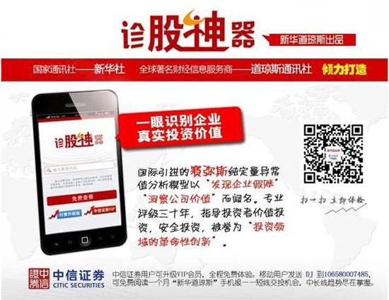 想聽(tīng)見(jiàn)股市花開(kāi)的聲音么?掃描圖片中二維碼,即刻關(guān)注“新華道瓊斯”微信服務(wù)號(hào)!輸入股票代碼,秒查個(gè)股投資財(cái)務(wù)安全評(píng)級(jí)!