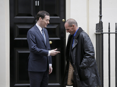 圖為2日,在英國首都倫敦的唐寧街,英國財政大臣喬治·奧斯本(左)迎候到訪的希臘財長瓦魯法基斯。