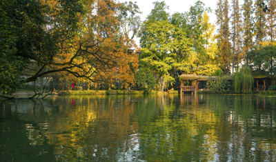 罨畫池位于城區(qū)中心,南鄰文廟,東連陸游祠,占地約38畝,素有川西名園之稱,是全國(guó)重點(diǎn)文物保護(hù)單位,始建于唐,成盛景于宋,亦曾稱“東亭”、“東湖”。園中散落陸游詞鐫刻數(shù)十處,池畔廊、橋、榭、軒、亭,假山疏密相間,步移景換,具有江南園林玲瓏秀雅的韻味。