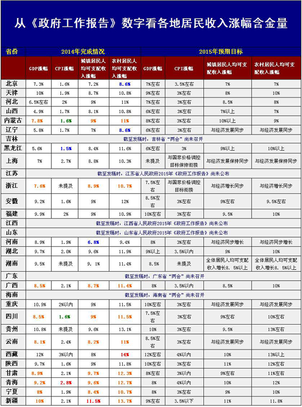 (表中數(shù)據(jù)來(lái)源于各省份2015年《政府工作報(bào)告》。其中,紅色數(shù)字為該項(xiàng)目最高值;藍(lán)色數(shù)字為該項(xiàng)最低值;綠色為CPI第二低;橙色數(shù)字表示該省份全年GDP增幅超過(guò)2014年全國(guó)GDP預(yù)期目標(biāo)的7.5%,且收入增幅雙雙超過(guò)GDP增幅)