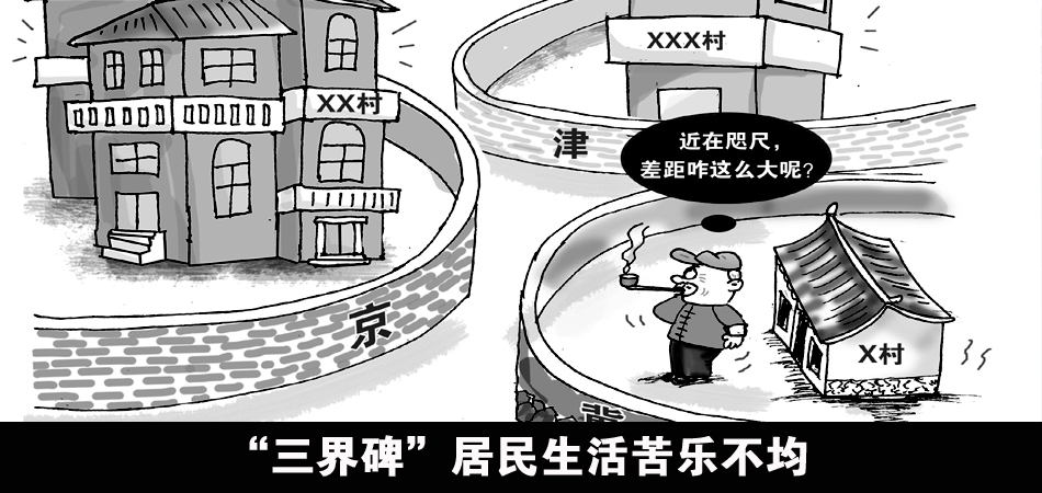 醫(yī)療、養(yǎng)老、教育等政策方面的差異更讓三地居民的生活拉開檔次。張立中告訴記者,北京將軍關村60歲以上老人每個月有養(yǎng)老金350元,到了90歲以上,每個月還會增加高齡補貼100元。而1公里外河北瀝水溝村的情況則相去甚遠,蔡金蓮說,他們村60歲以上老人每個月養(yǎng)老金55元,90歲以上高齡補貼每年600元。三界碑另一側,據(jù)張雪松介紹,天津前干澗村60歲以上老人每月養(yǎng)老金80元,70歲以上每月養(yǎng)老金90元,80歲及以上每月100元。