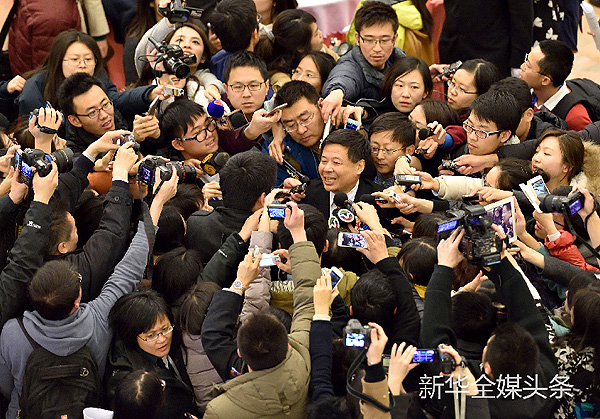 記者圍堵采訪全國政協(xié)委員、財政部副部長朱光耀!柏斏駹敗本褪鞘荜P(guān)注。新華社記者 李鑫 攝