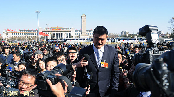 3月3日,中國人民政治協(xié)商會(huì)議第十二屆全國委員會(huì)第三次會(huì)議在北京人民大會(huì)堂開幕。這是記者們?cè)谌嗣翊髸?huì)堂東門外廣場(chǎng)拍攝全國政協(xié)委員姚明。 新華網(wǎng) 翟子赫 攝