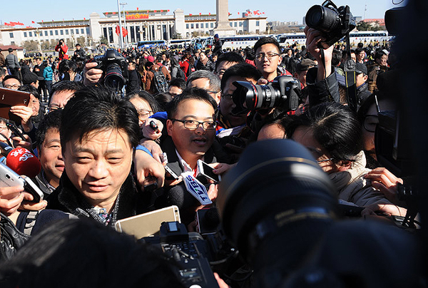 3月3日,中國(guó)人民政治協(xié)商會(huì)議第十二屆全國(guó)委員會(huì)第三次會(huì)議在北京人民大會(huì)堂開(kāi)幕。這是記者們?cè)谌嗣翊髸?huì)堂東門(mén)外廣場(chǎng)采訪全國(guó)政協(xié)委員崔永元。 新華網(wǎng) 翟子赫 攝