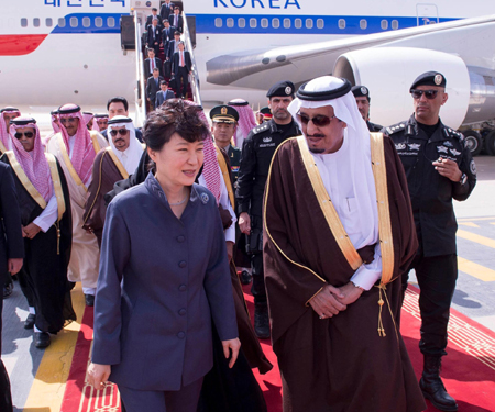 3月3日,沙特阿拉伯國王薩勒曼(前右)在首都利雅得迎接到訪的韓國總統(tǒng)樸槿惠(前左)。 據(jù)沙特國家通訊社報道,薩勒曼當(dāng)天與樸槿惠就雙邊關(guān)系舉行會談,雙方表示將進(jìn)一步加強在各個領(lǐng)域的友好合作。會談后,在薩勒曼和樸槿惠的主持下,兩國相關(guān)部門簽署了關(guān)于海洋運輸和核能建設(shè)的合作諒解備忘錄。