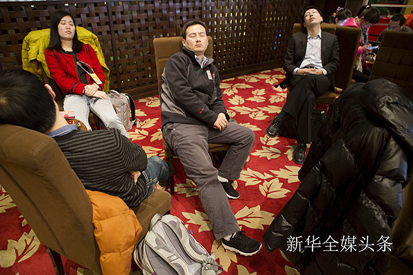 人前風(fēng)光亮麗,人后辛苦不易!半S時(shí)隨地養(yǎng)精蓄銳”是兩會(huì)記者必須get的技能。 新華社記者 才揚(yáng) 攝