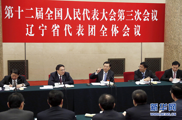 3月8日,中共中央政治局常委、全國人大常委會委員長張德江參加十二屆全國人大三次會議遼寧代表團(tuán)的審議。 新華社記者 鞠鵬 攝