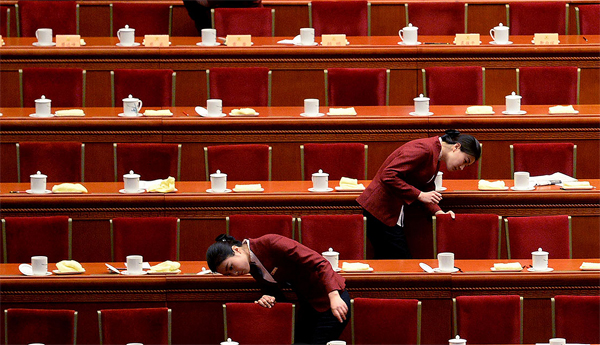2015年3月3日,北京,全國(guó)政協(xié)十二屆三次會(huì)議開(kāi)幕會(huì)在人民大會(huì)堂舉行。服務(wù)員在會(huì)后檢查會(huì)場(chǎng)。
