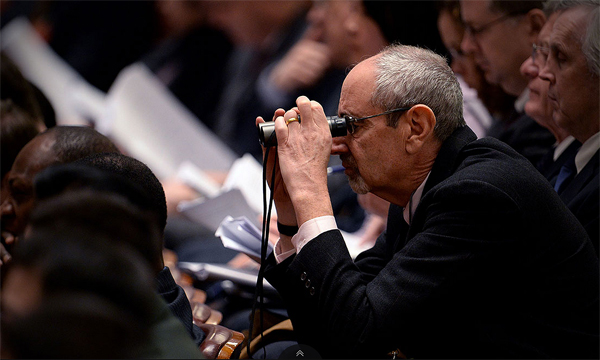 十二屆全國人民代表大會第三次會議在人民大會堂舉行開幕會。一名外國大使在會上使用望遠鏡。