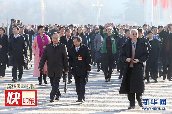 3月10日,全國政協(xié)十二屆三次會議在北京人民大會堂舉行第三次全體會議。這是全國政協(xié)委員抵達(dá)天安門廣場。新華社記者 呂迅 攝