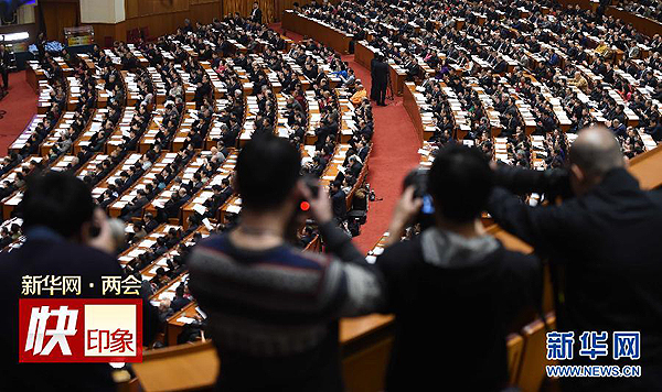 3月10日,全國(guó)政協(xié)十二屆三次會(huì)議在北京人民大會(huì)堂舉行第三次全體會(huì)議。這是記者在會(huì)場(chǎng)采訪拍攝。 新華社記者 陳曄華 攝