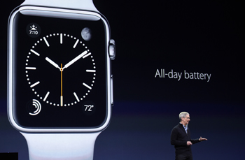 圖為當(dāng)?shù)貢r(shí)間9日,蘋果公司首席執(zhí)行官蒂姆·庫克在舊金山介紹AppleWatch。
