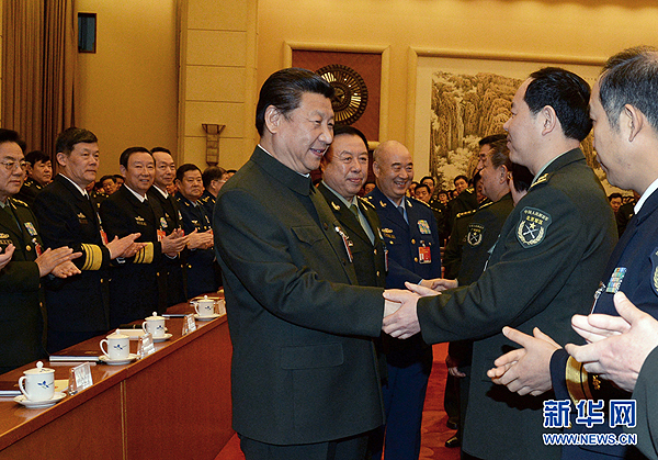 3月12日,中共中央總書記、國家主席、中央軍委主席習(xí)近平出席十二屆全國人大三次會議解放軍代表團全體會議并發(fā)表重要講話。這是習(xí)近平同軍隊人大代表親切握手。新華社記者 李剛 攝