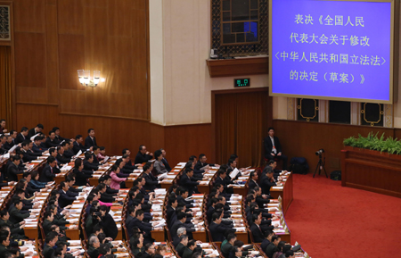 第十二屆全國人民代表大會第三次會議圓滿完成各項議程15日上午在人民大會堂閉幕。大會表決通過關于修改立法法的決定,國家主席習近平簽署第20號主席令予以公布。 修改后的立法法將“稅收”專門列出,作為只能制定法律的事項,明確“稅種的開征、停征和稅收征收管理的基本制度”只能由法律規(guī)定。 圖為代表們在會上表決。